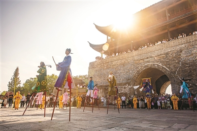 10月1日,衢州古城非遗秀在水亭门、县学街和北门街上演,龙游丈二高跷“八仙送福”和十二花神巡游为游客送上节日祝福。